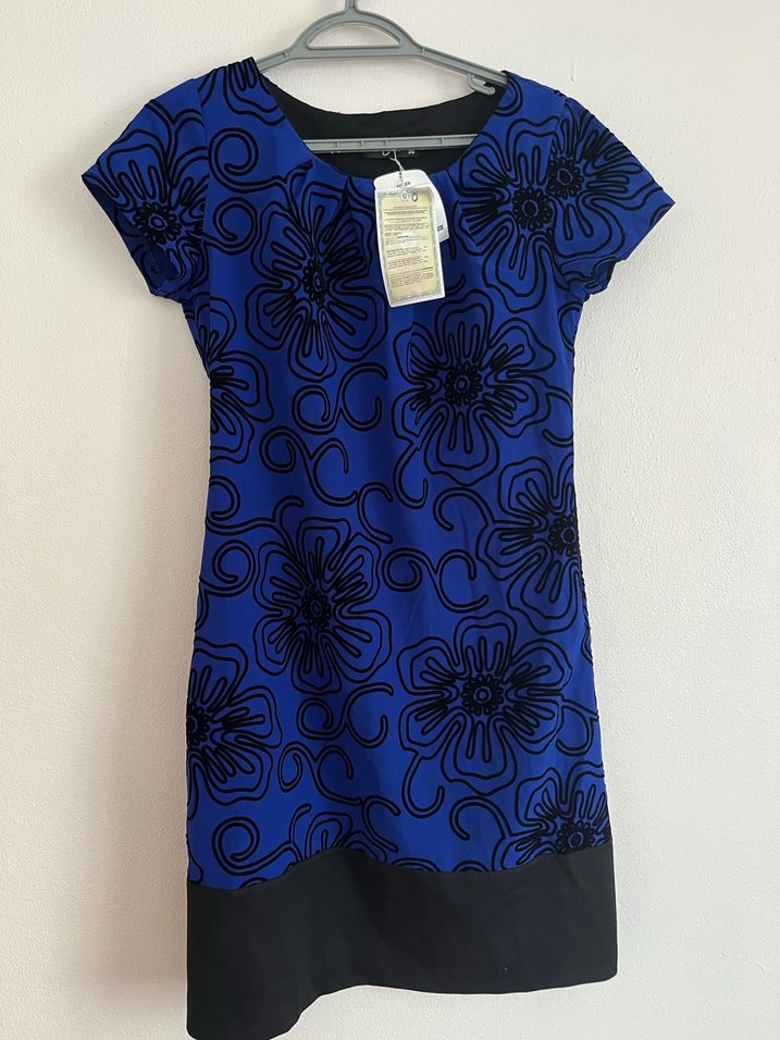 Sentetik kumaştan, kısa kollu, bisiklet yaka, mavi üzerine siyah çiçek baskılı, oturan kesim. Alt kısmı siyah detaylı, günlük kullanıma uygun bohem tarz.