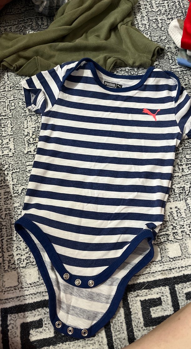 Orijinal puma erkek bebek zıbını Kısa kollu, yuvarlak yakalı, koyu mavi-beyaz çizgili pamuklu erkek bebek body. Düğmeli kapama ile kolay kullanım sağlar. Rahat sokak stili için uygundur.