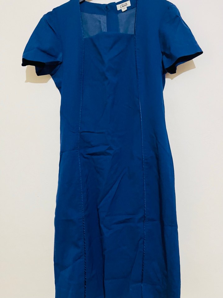 Koyu mavi kısa kollu kalem elbise, notched lapel yaka ve midi boydadır. Sentetik kumaştan, drapeli ve normal kesimdir. Ofis kullanımı için uygundur.