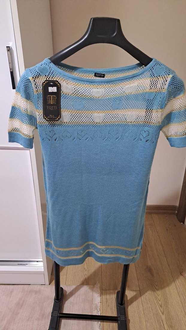 Kısa kollu, kayık yakalı, mavi örgü triko kazak.mavi çizgili günlük sokak stiline uygun.
