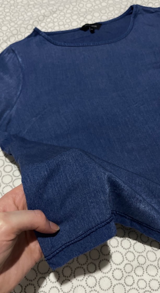 kısa kollu, yuvarlak yakalı, parlak denim kumaştan yapılmış, normal midi boyda, mavi yumuşak yapılı tshirt Bedeni 40 yazıyor ama 36 bedende salaş olarak kullanıldı.