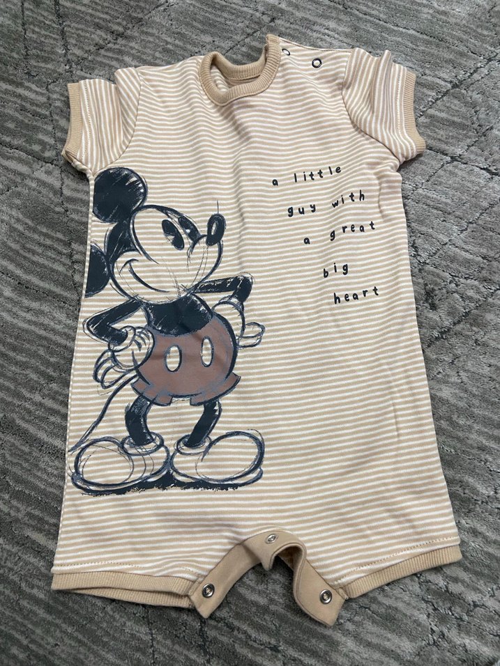 Kısa kollu, pamuklu kumaştan yapılmış, baskılı Mickey tasarımlı ve çıtçıtlı erkek bebek tulumu.