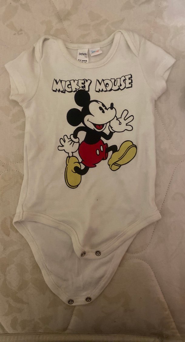 Pamuk kumaştan yapılmış, kısa kollu ve bisiklet yakalı beyaz bebek tulumu. Mickey Mouse baskılı ve düğmeli, rahat kullanım sağlar.