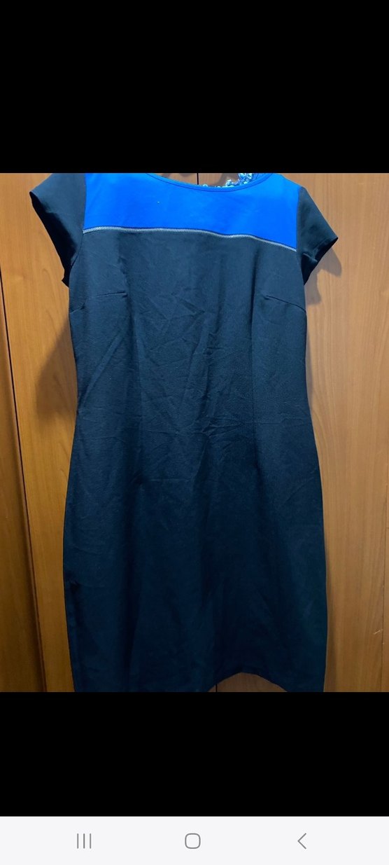 Kısa kollu, koyu mavi renkte, düz midi elbise. Ofis kullanımı için uygundur.