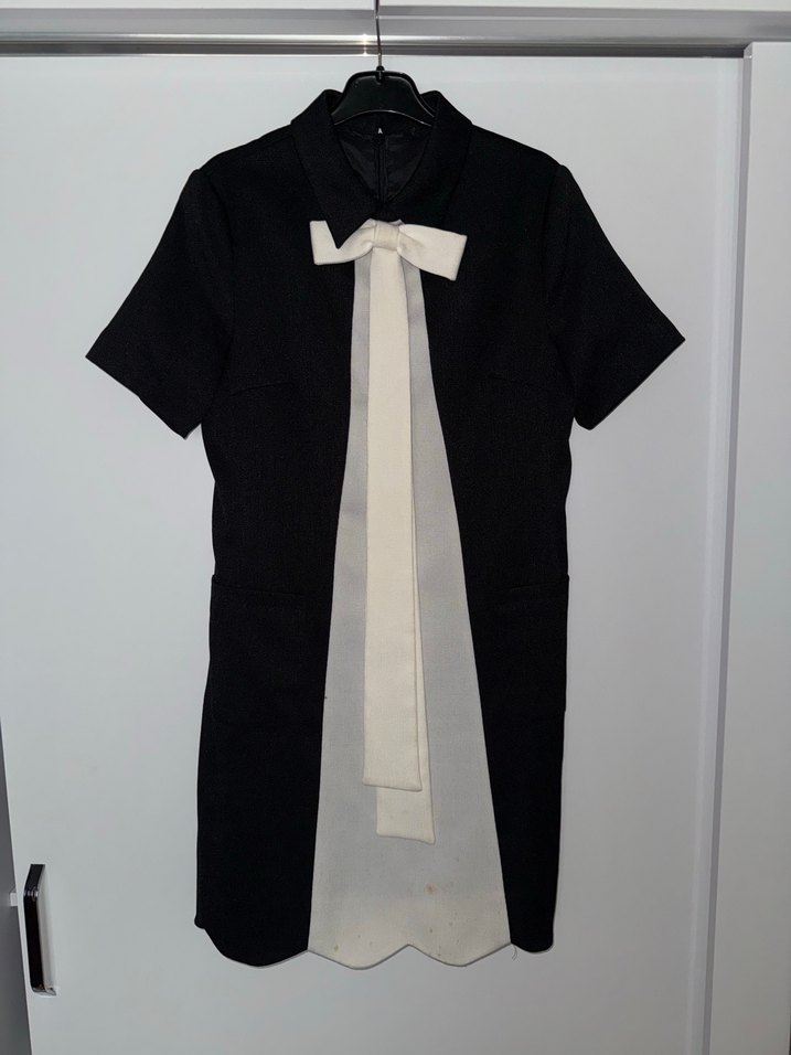 Siyah midi elbise, kısa kollu, halter yakalı ve önünde beyaz fiyonk detayıyla ofis için düzenli kesim sunar.