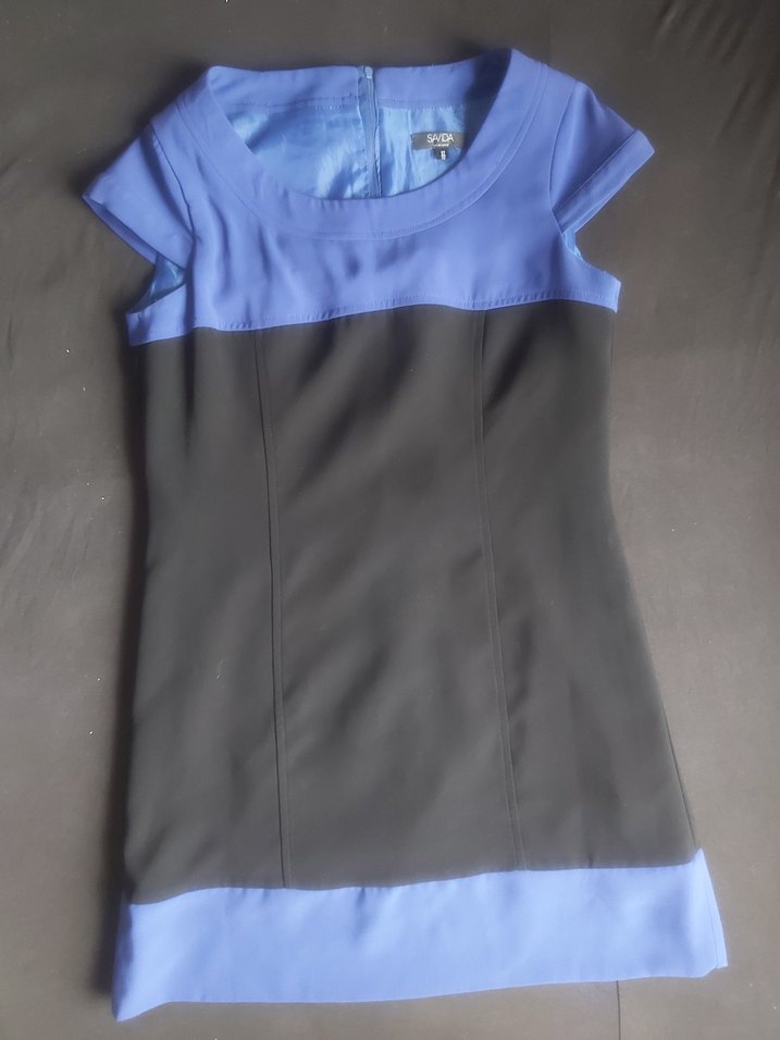 Kısa kollu, bisiklet yaka elbise, mavi ve siyah kumaştan üretilmiştir. Düz ve şık tasarımıyla ofis kullanımı için uygundur.