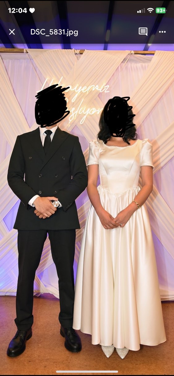 Beyaz, vücuda oturan A kesim gelinlik, kesik yaka ve kısa kollu olup klasik zarafeti modern tarzla buluşturur. Midi boyda, zamansız bir düğün görünümü sağlar. Kol ucu , yaka ve bel çevresi inci ve Kristal işlemeli, ben nişanımda tercih ettim özel dikim aldım başka yerde giymeyeceğim için satıyorum , nişanlık, gelinlik ve nikah elbisesi olarak da kullanılıyor. 38 beden Marka temsilidir