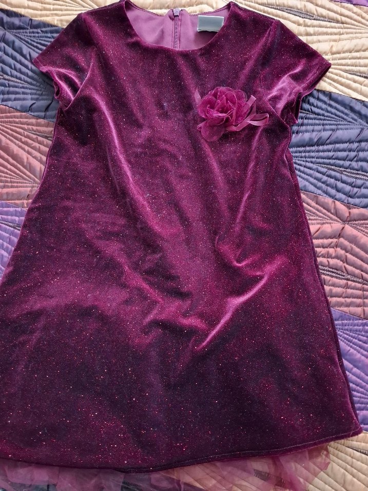 Kısa kollu, V yakalı ve oturan kesim mor kız çocuk elbisesi. Göğüste çiçek detaylı ve yumuşak sentetik kumaştan yapılmıştır. ✨