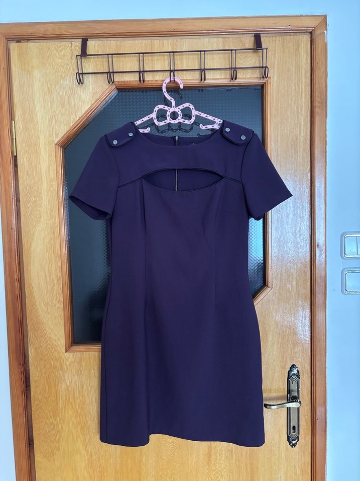 Large/40 beden Kısa kollu, bisiklet yaka ve omuzlarda düğme detaylı, vücuda oturan mor midi elbise.