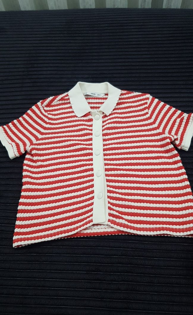 Kısa kollu, yakalı ve kısa boylu bu kadın gömleği, örgü kumaştan yapılmıştır. Canlı kırmızı-beyaz çizgili deseniyle rahat sokak stiline uygundur.
