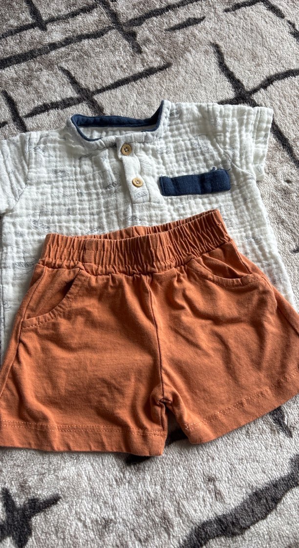 Kısa kollu, düğmeli, yuvarlak yakalı pamuklu bebek takımı. Gri ve kahverengi bohem tarzda, rahat lastikli şort ile birlikte. Hediye geldi hiç kullanılmadı