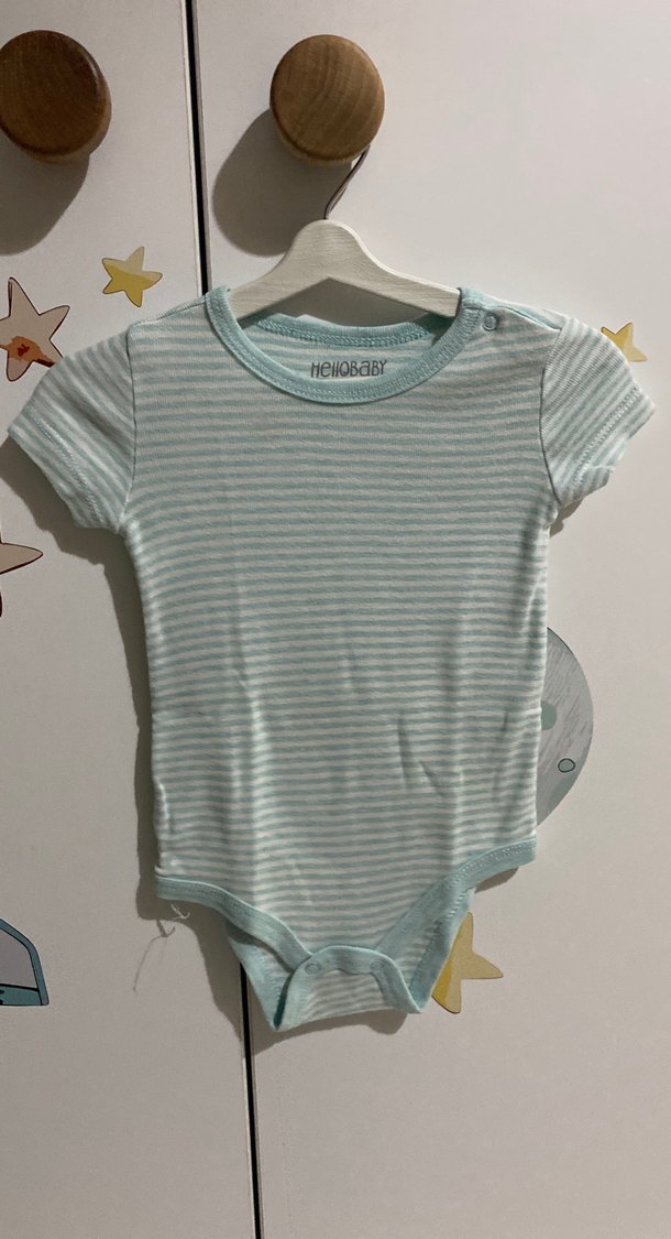 Yeşil çizgili bebek zıbını, kısa kollu ve yuvarlak yakalıdır. Yumuşak pamuktan üretilmiş, rahat kullanıma uygundur. Çok hafif lekesi mevcut