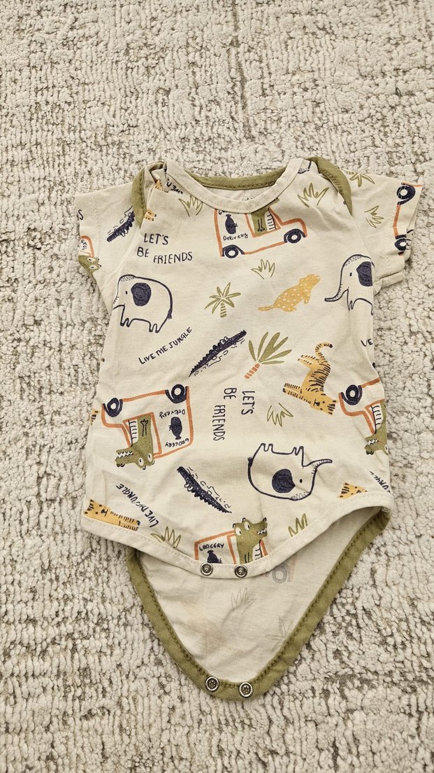 Gri ve kahverengi renklerde, kısa kollu ve bisiklet yaka pamuklu bebek body. Hayvan ve araç desenleri ile 'LET'S BE FRIENDS' yazıları bulunur. Yumuşak ve örme detaylıdır.