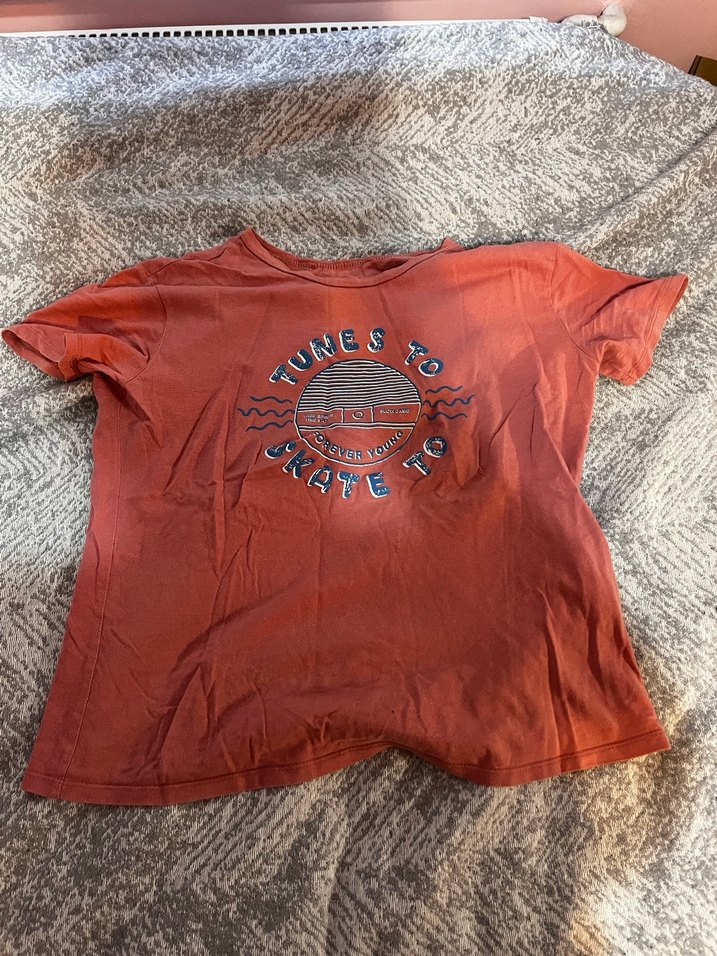 pamuklu, kısa kollu, bol kesim kırmızı tişört. Parlak baskılı deseni ve düğme detaylarıyla dikkat çeker.