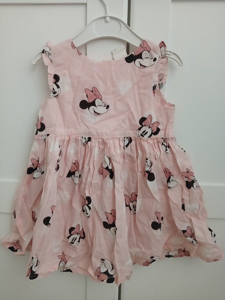 Kısa kollu fırfırlı ve bol kesim pembe elbise, baskılı Minnie Mouse desenli. Sentetik kumaştan, rahat sokak stili için uygun.