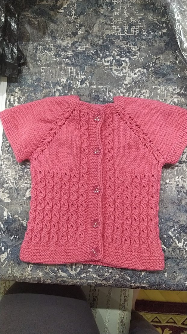 Kısa kollu, pembe renkli ve örgü dokulu vintage tarzda kız hırkasıdır. Önden düğmeli ve detaylı desenlidir.