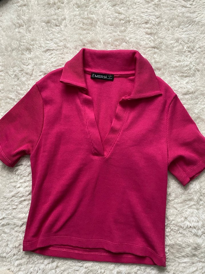 pembe, v yaka ve kısa kollu, yumuşak sentetik kumaştan yapılmış dar kesim polo tişört. Rahat ve şık sokak stili görünümü sunar.