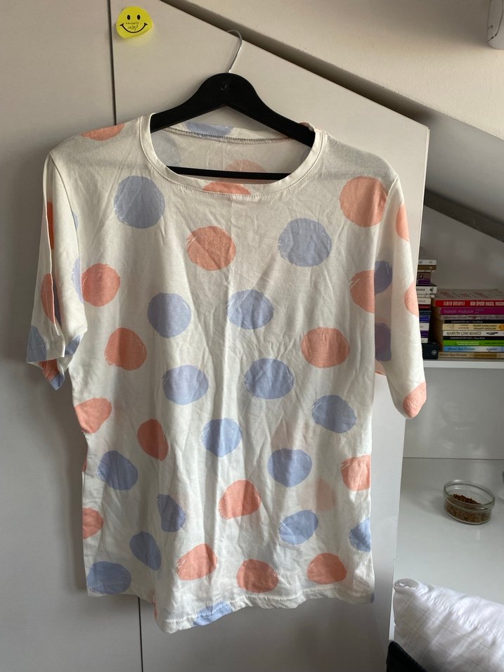 Pamuk kumaştan,kısa kollu, yuvarlak yakalı, bol kesim Pastel renkli baskılı desenli, midi boyda,i