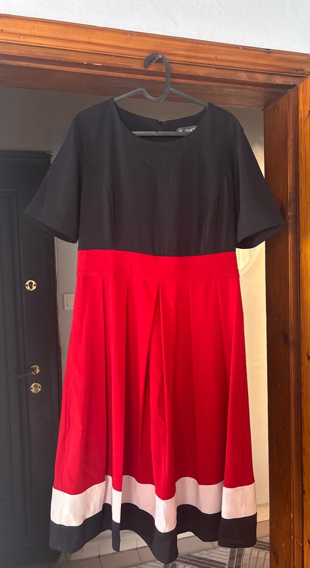 Kadınlar için kısa kollu, yuvarlak yakalı, bol kesim midi elbise. Siyah üst kısmı ve kırmızı pilili eteğiyle ofis için uygundur. 2 defa giyildi