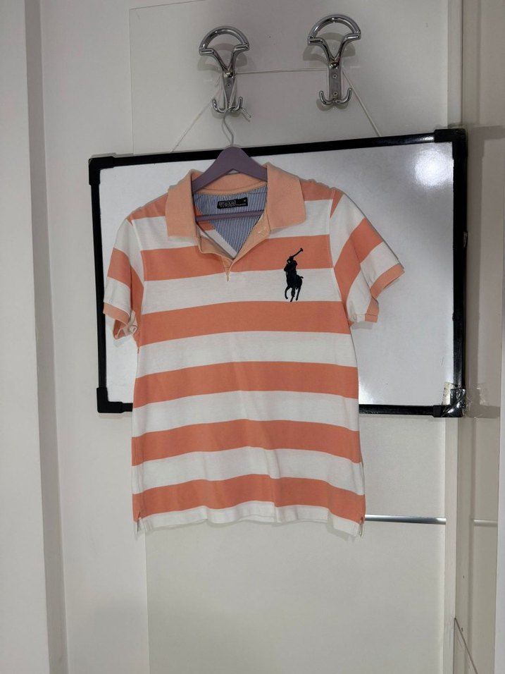 Pamuk kumaştan yapılmış, kısa kollu, yakalı ve düğmeli bej ve açık turuncu çizgili, dar kesim erkek polo tişört. Rahat sokak stili için uygun.