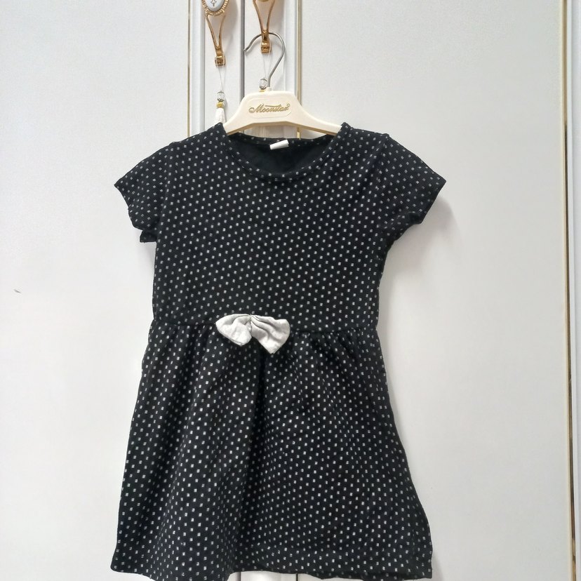 Kısa kollu, bisiklet yaka ve gri fiyonk detaylı, siyah zemin üzerinde puantiyeli, sentetik kumaştan yapılmış dar kesim kız elbisesi. 1 3 dfa kullanildi Sorunsuz