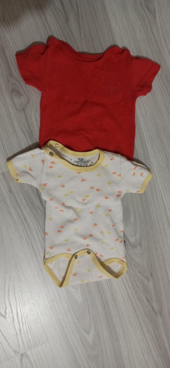 Kısa kollu, yuvarlak yakalı, renkli desenli bebek body. Üzerinde düğmeler bulunur, beyaz zemin üzerine sarı detaylıdır.