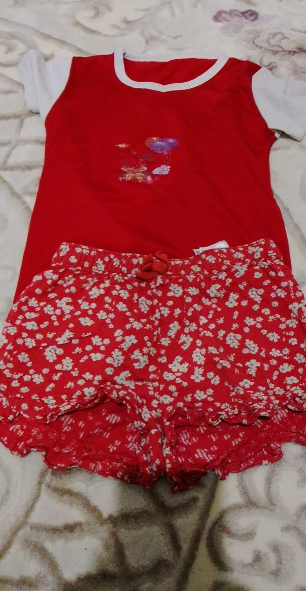 Rahat kesim, kısa kollu ve renkli desenli kız çocuk pijama takımı. Kırmızı üst ve çiçekli mini şortlardan oluşur, bohem tarzda.