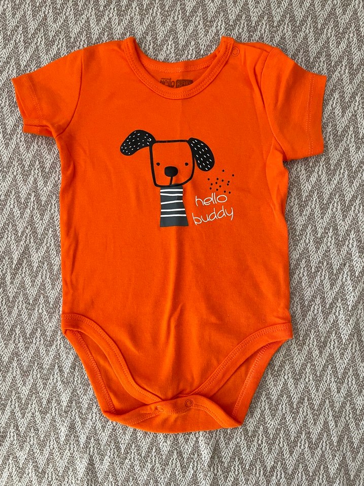 Kısa kollu, yuvarlak yakalı, renkli baskılı erkek bebek body. Sadece 1 defa kullanıldı.