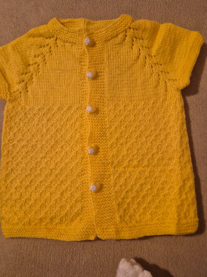 Kısa kollu, sarı ve parlak iplikle örülmüş, bohem tarzda kız hırkasıdır. Düğmeli ön kapamaya sahiptir.