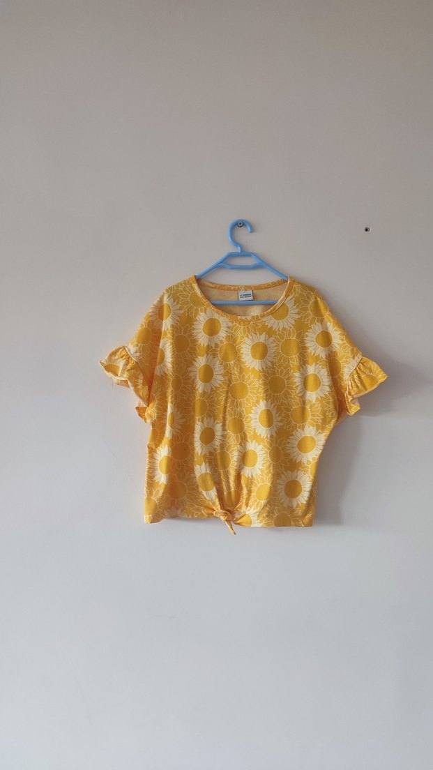 Kısa kollu, volan detaylı, sarı papatya desenli, bol kesim ve yuvarlak yakalı kız çocuk bluzu. Tekstil kumaştan üretilmiştir.