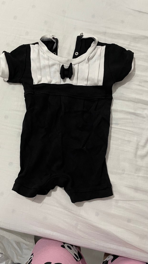 Kısa kollu, düğmeli yakalı ve küçük fiyonk detaylı siyah bebek tulumu, pamuklu yumuşak kumaştan üretilmiştir. İki kez kullandık 6 9 ay uyumlu