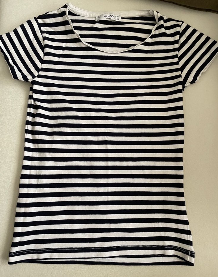 Pamuk kumaştan, kısa kollu, tekne yaka, siyah beyaz çizgili, normal boyda, dar kesim kadın tişörtü. Paris sokak modasına uygun, gündelik kullanıma uygun.