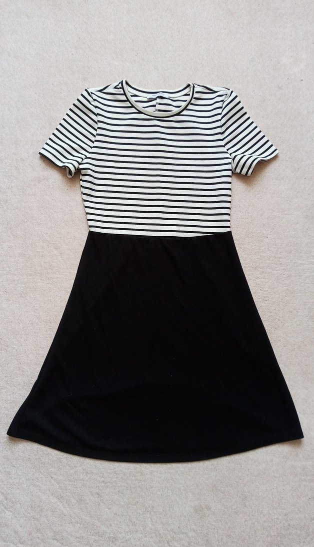 Kısa kollu, kruvaze yaka, siyah-beyaz çizgili üst ve siyah pileli etek kısmı olan midi elbise. Yumuşak sentetik kumaştan, günlük rahat kullanım için uygundur.