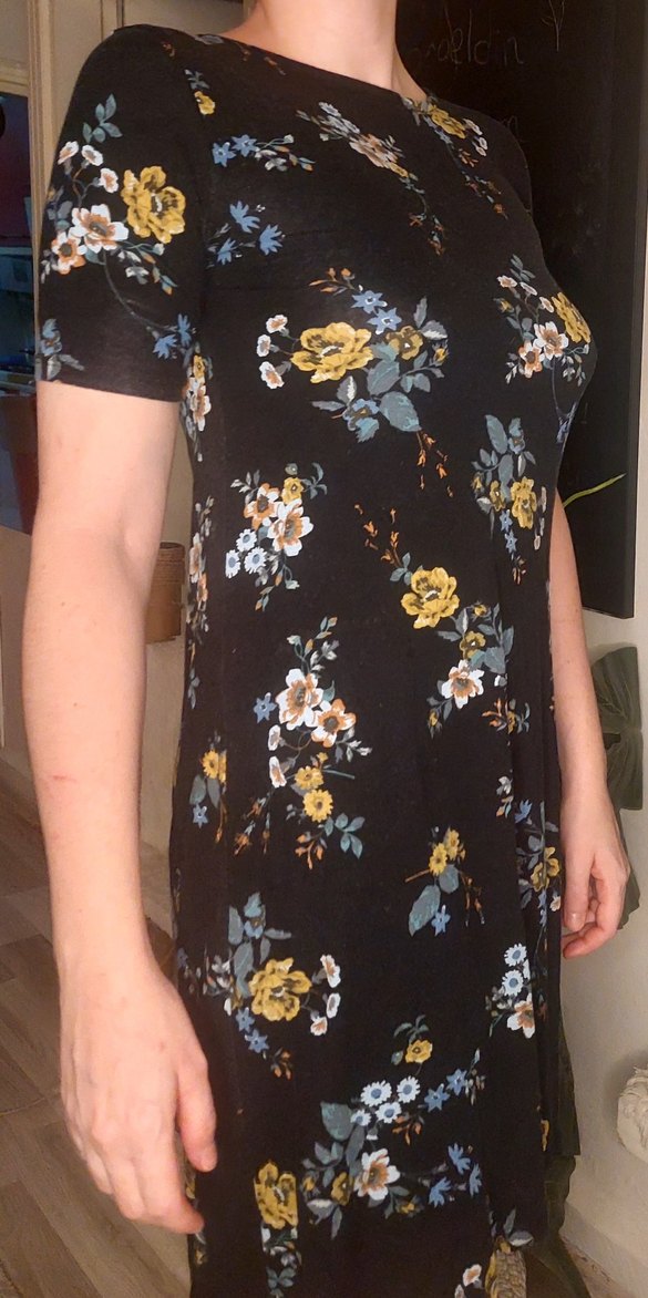Kısa kollu, yumuşak penye kumaştan yapılmış, çiçek desenli siyah mini elbise. Günlük kullanıma uygun.