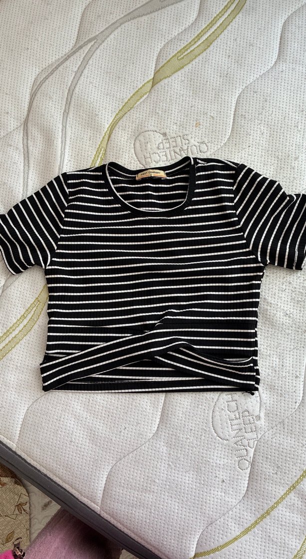 Kısa kollu, bisiklet yaka, beyaz çizgili siyah crop top. Pamuklu kumaştan, pilili detaylı ve günlük kullanıma uygun.