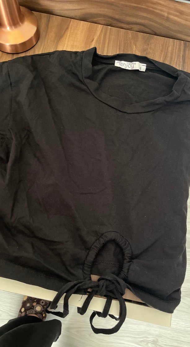 Siyah, kısa kollu, yuvarlak yaka ve bol kesim hamile tişörtü. Alt kısmında bağcıklı detay bulunur, yumuşak sentetik kumaştan üretilmiştir.