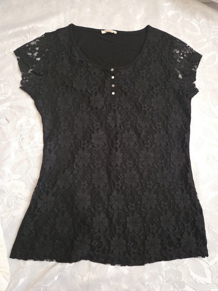Siyah, kısa kollu, dantel detaylı ve yuvarlak yakalı, önünde düğme süslemeli, vücuda oturan bluz. Örgü yapısıyla dokulu görünüm sunar, günlük kullanım için uygundur. adet fiyatıdır