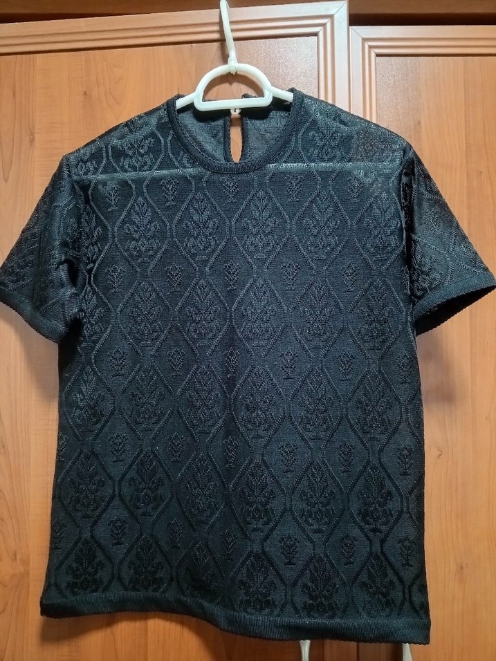 Kısa kollu, yuvarlak yakalı boyun arkasında iki küçük brit girişli düğmesi var biri düşmüş. Siyah sentetik kumaştan, dantel desen görünümlü. İçini gösteriyor. S ve M bedene olur. Çok şık duruyor. Birkaç kez giyildi.