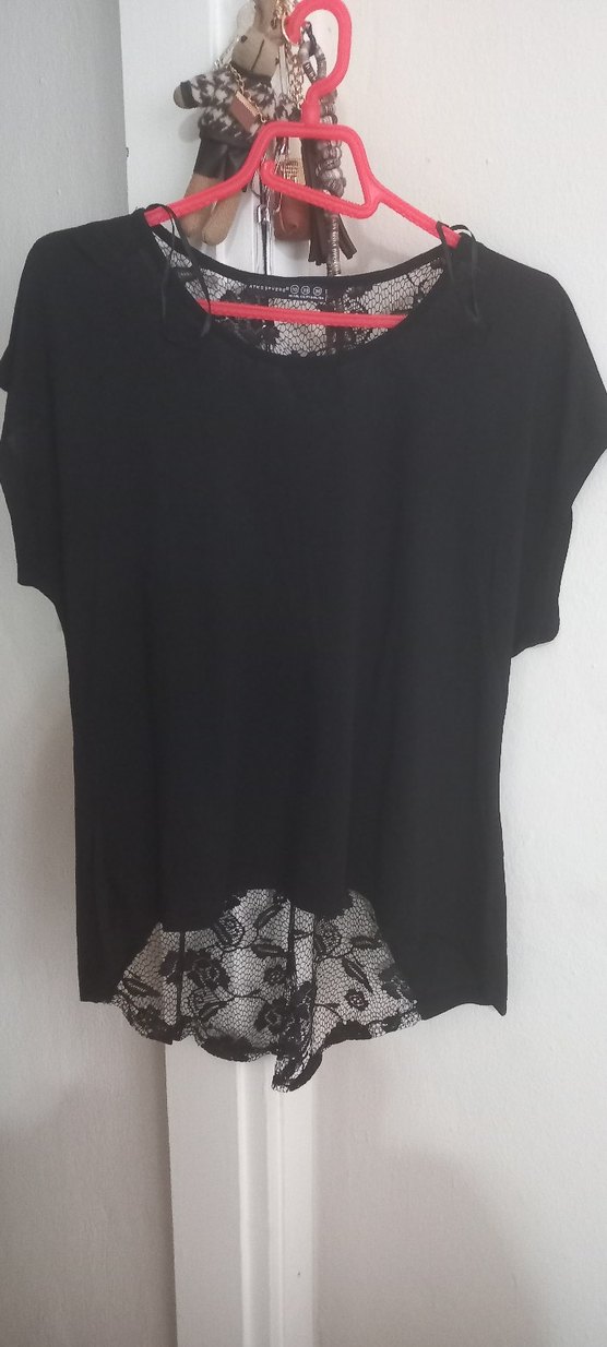 Kısa kollu, yuvarlak yakalı ve bol kesim siyah gömlek, uç kısmında dantel detaylarla gotik tarz sunar. Günlük kullanım için uygundur. S/M/L olur