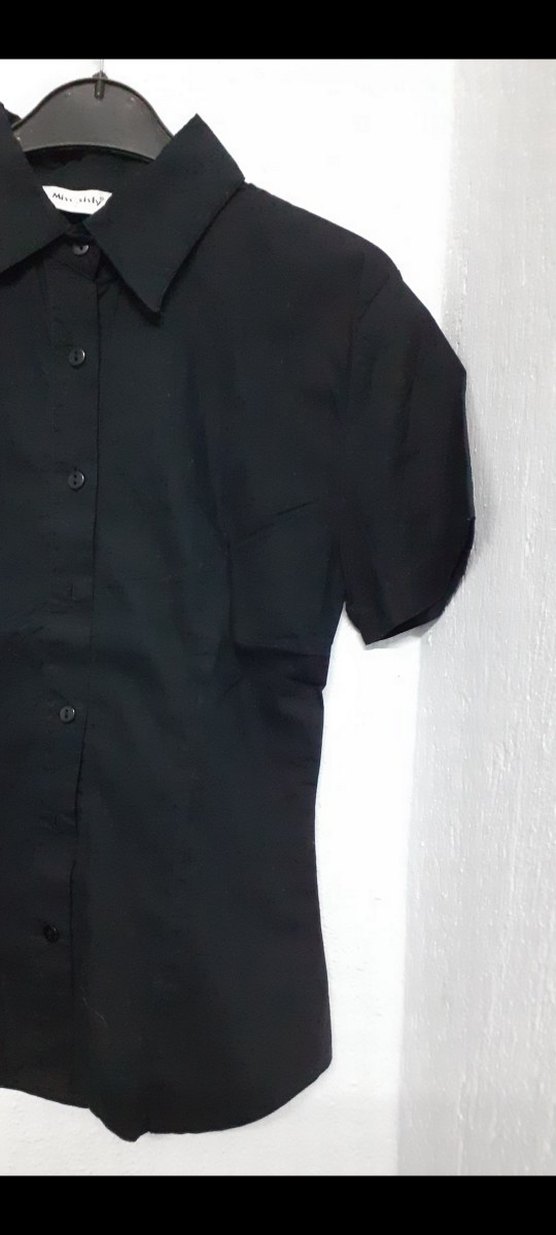 Kısa kollu, yakalı ve düğmeli siyah kadın gömleği. Sentetik kumaştan, ofis için uygun, düz ve gotik tarzda.