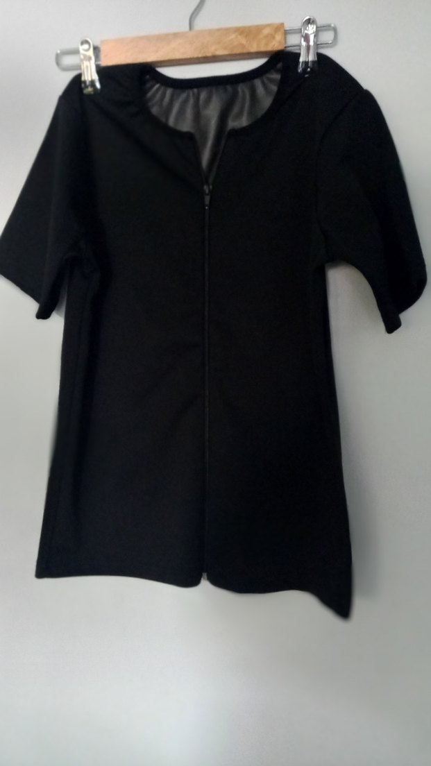 Siyah, kısa kollu, yüksek yakalı ve fermuarlı ince ceket.Sentetik kumaştan, minimalist gotik tarzda, günlük kullanım için uygundur. spor yapanlar için uygun.terletmek için kullanılıyor