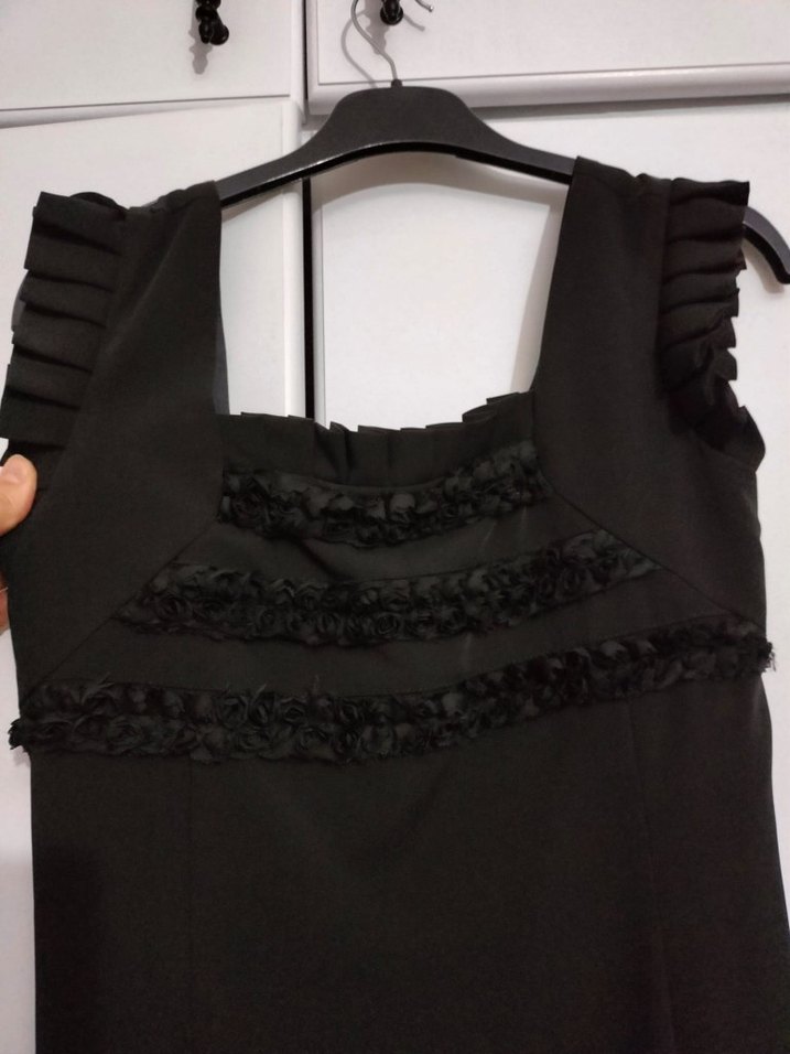 V yaka ve kolsuz tasarıma sahip bu siyah elbise, fırfır detaylarıyla gotik ve şık bir görünüm sunar, ofis için uygundur.