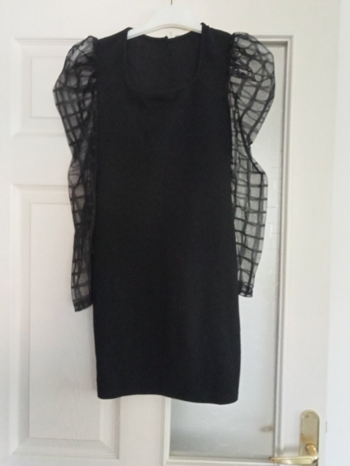 Dar kesim siyah gotik midi elbise, transparan kare desenli kısa kollu ve kruvaze yaka detaylarıyla, hafif fırfır süslemelidir.
