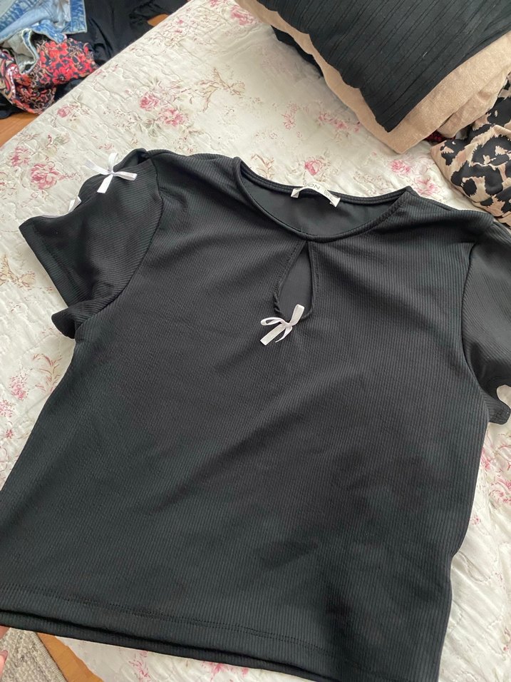 Kısa kollu, bisiklet yaka, siyah . İnce kumaş ve küçük fiyonk detaylarıyla sade ve şık bir tasarım sunar.