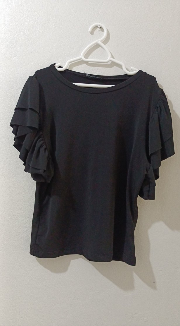 Kısa kollu, fırfırlı kolları ve yuvarlak yakası olan siyah kadın bluz. Yumuşak kumaşlı çok şık bana büyük bir iki kere ancak giyilmiştir.