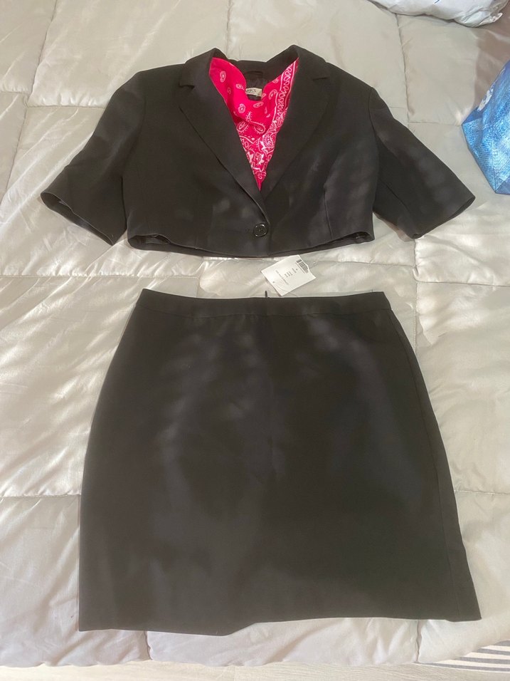Kısa kollu, düğmeli, kruvaze yakalı crop ceket ve midi etekten oluşan, siyah, dar kesim kadın takım elbisesi. Ofis için uygun, sentetik kumaştan.