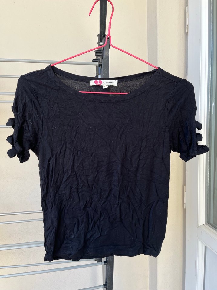 Kısa kollu, fırfırlı detaylı siyah kadın tişörtü, yumuşak sentetik kumaştan, salaş kesim ve bisiklet yaka ile günlük sokak stili için uygundur.
