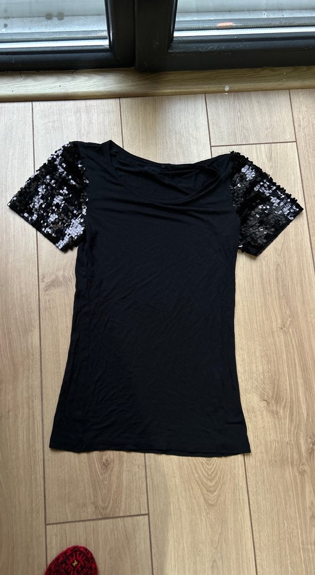 Kısa kollu, pul işlemeli kolları ve bisiklet yakasıyla siyah, fit kesim kadın tişörtü. Gotik tarzda, romantik akşamlar için uygun.