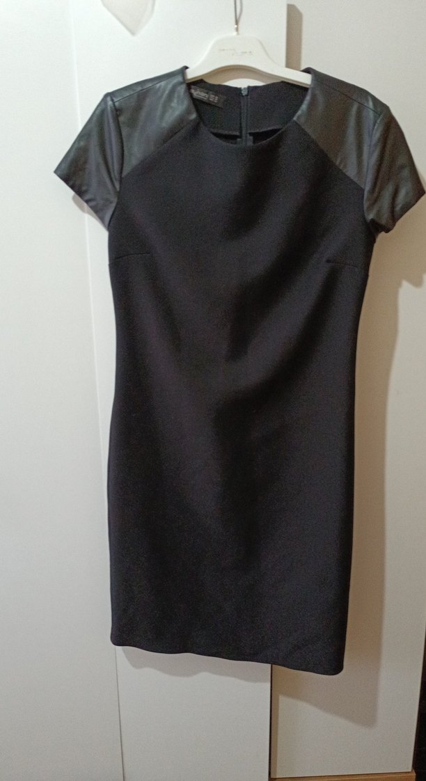 Kısa kollu, bisiklet yaka, deri görünümlü detaylara sahip siyah midi elbise. Drapeli ve vücuda oturan kesimiyle iş ortamı için uygundur. belli belirsiz kusurları vardır elimden geldiğince en yakından çektim