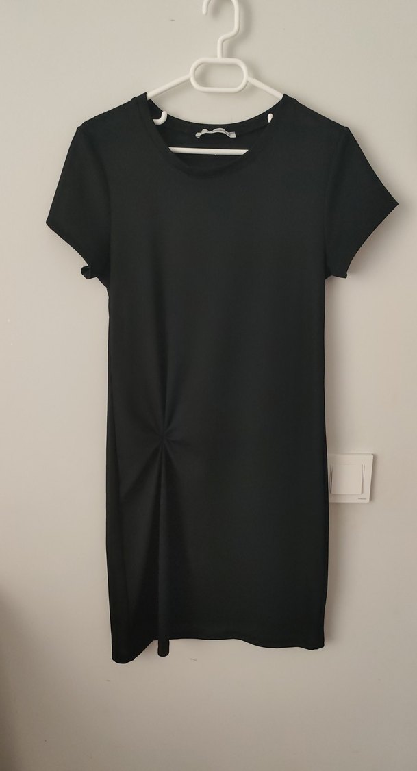 Düz siyah midi elbise, kısa kollu ve bisiklet yaka, sentetik kumaştan. Pliseli detaylı, minimalist ve ofis için uygun.